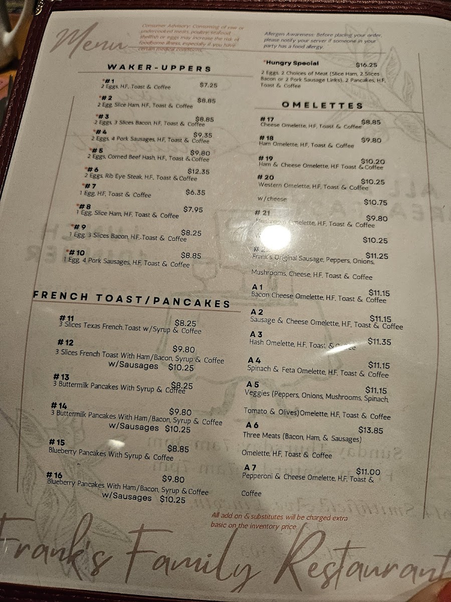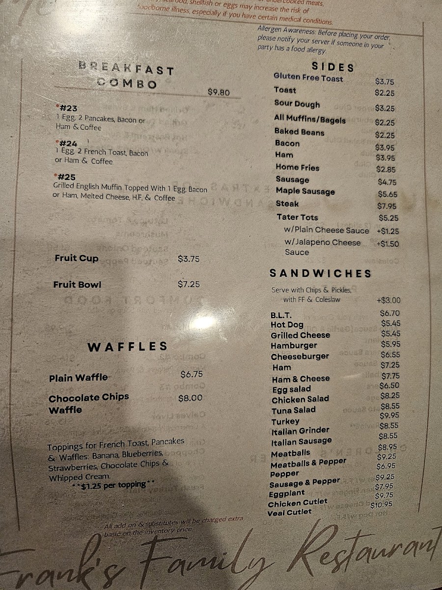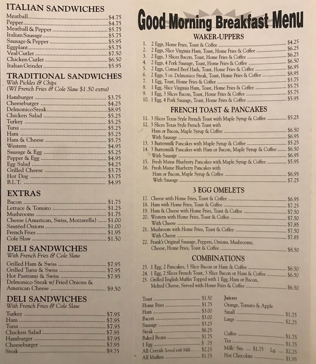 Breakfast is clearly a highlight, with extensive “wake-up” combinations and omelets such as the Cheese Omelette, Western Omelette, and Frank’s Original Sausage, Peppers, Onions, Mushrooms, Cheese Omelette, all served with toast and coffee. Sweet options like 3 Slices Texas Style French Toast, 3 Buttermilk Pancakes, and Fresh Maine Blueberry Pancakes round out the morning offerings perfectly. Overall, the menu at Frank’s Restaurant feels complete and dependable-a comforting conclusion to any meal, reflecting consistency, variety, and the timeless appeal of classic diner dining.