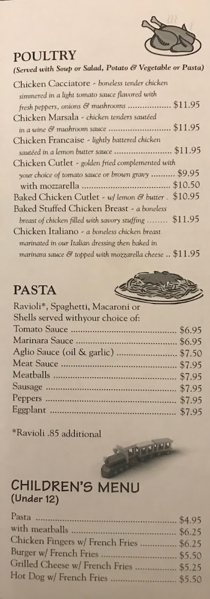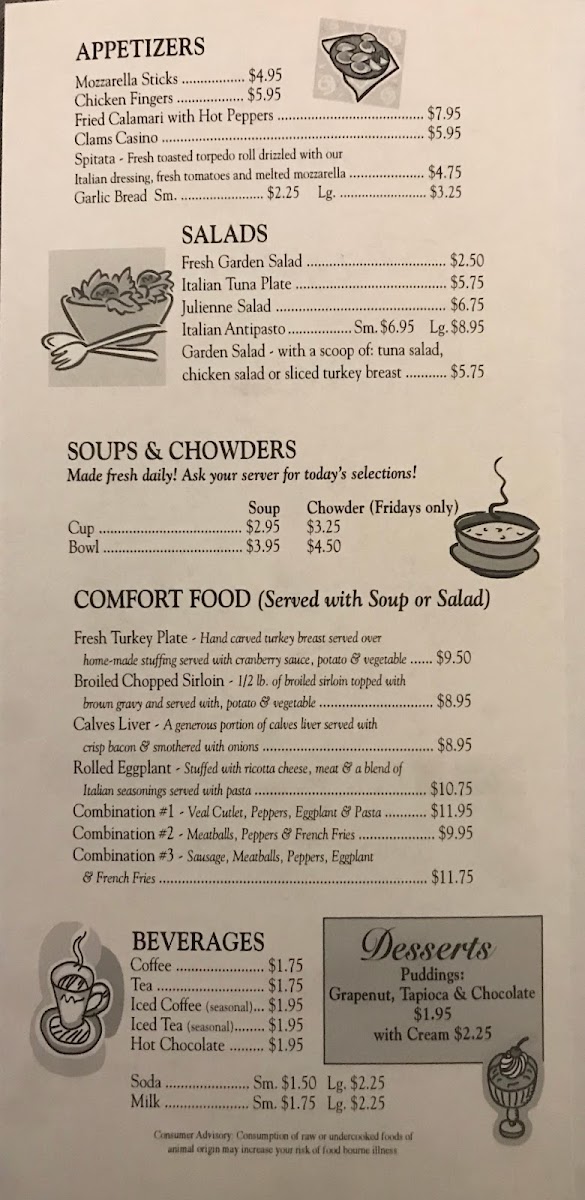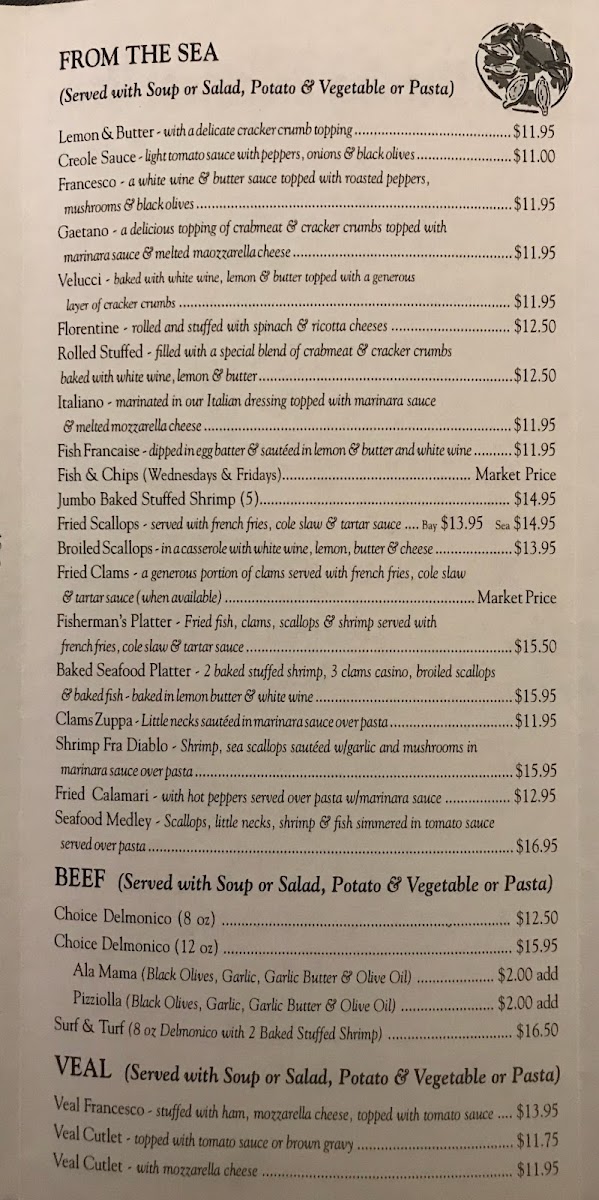 What truly defines the menu is its dedication to comfort food classics. Plates like the Fresh Turkey Plate, Broiled Chopped Sirloin, Calves Liver, and Rolled Eggplant showcase generous, homestyle cooking, complemented by reliable sides such as Toast, Sour Dough, All Muffins, and Baked Beans. For something quick and satisfying, sandwiches including the B.L.T, Grilled Cheese, Hamburger, and Cheeseburger deliver exactly what you expect from a neighborhood favorite. Seafood and premium entrées-like Surf & Turf, Choice Delmonico, Veal Francesco, and house seafood styles such as Lemon & Butter or Creole Sauce-add depth and variety for heartier appetites.